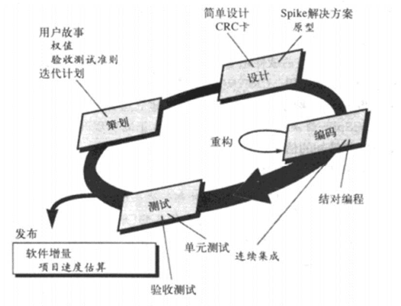 最为广泛使用的敏捷过程,包括策划、设计、编码、测试,四个框架活动的规则和实践