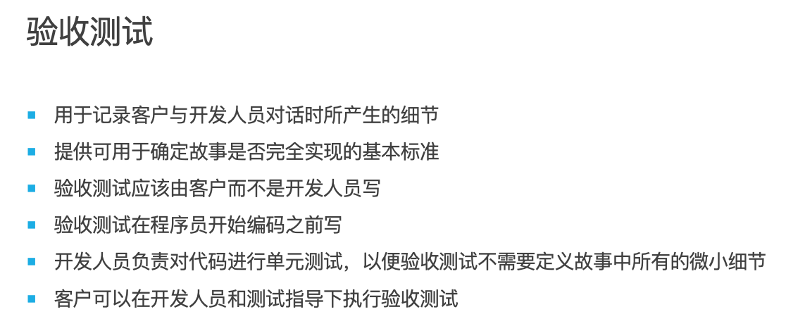 - 验收测试由用户定义,着眼于用户可见的,可评审的系统级的特征和功能