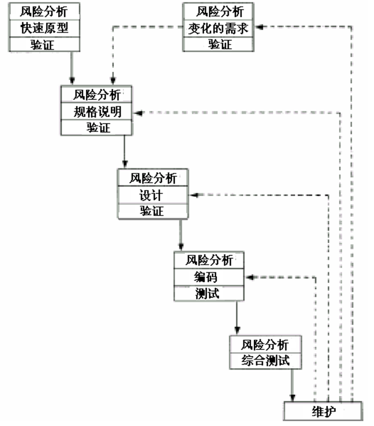 将瀑布模型与快速原型模型结合起来,并且加入两种模型均忽略的风险分析。可以把他看作每个阶段之前都增加了风险分析过程的快速原型模型