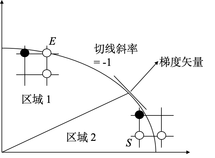 令D(T)为T点到原点距离的平方与半径的平方之差,D(S)为S点到原点距离与半径平方之差。令P的坐标为$(x_i, y_i)$,则T点的坐标为$(x_i+1, y_i)$,S的坐标为$(x_i+1, y_i-1)$。则