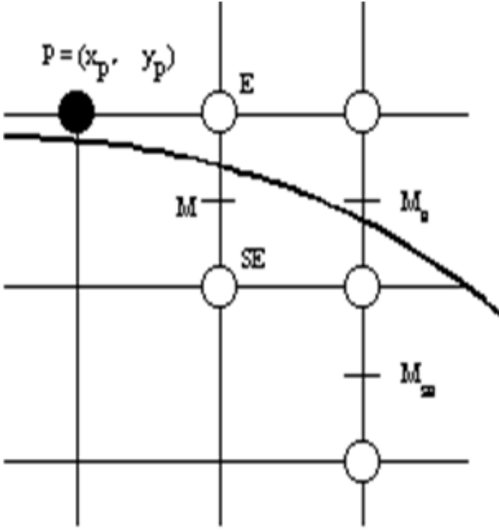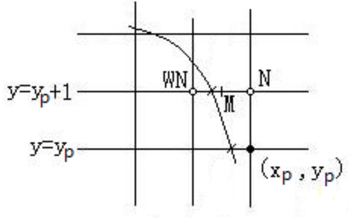 假设已计算出当前像素为P=(Xp,Yp),则下一个扫描列只可能是N和WN。中点$M=(X_p-\dfrac{1}{2},Y_p+1)$。