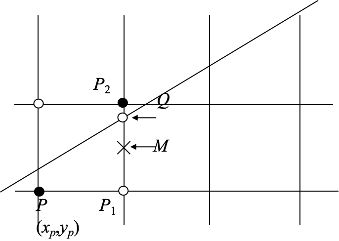 假定直线斜率 0 < k < 1,且已确定当前处理过的像素点$P(x_p,y_p)$,则下一个与直线最接近的像素只能是P1或P2。设M为P1与P2的中点,Q为交点。现确定下一个要画的像素的位置.