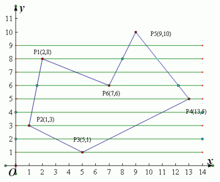 在多边形的填充算法中,关键是求扫描线与各边的交点问题,这里面有两个问题需要解决