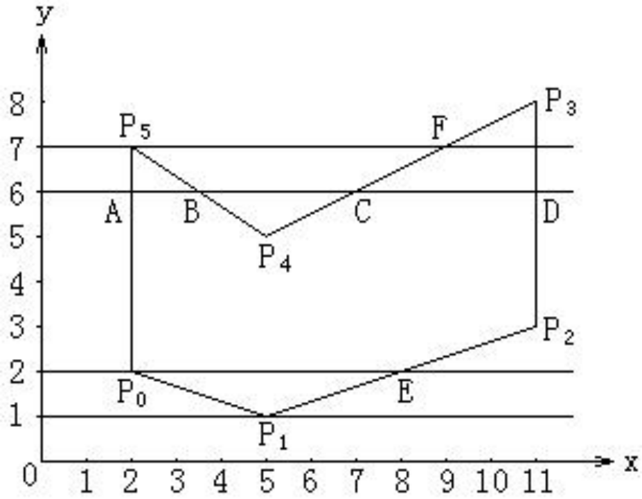 多边形采用顶点序列表示时,如$P_0P_1P_2P_3P_4P_5$ ,把扫描线6分别与边$P_0P_1$,$P_1P_2$,$P_2P_3$,$P_3P_4$,$P_4P_5$,$P_5P_0$,相交,得到的交点序列是D、C、B、A. 必须经过重新排序,最终得到从左到右,按x递增顺序排列的交点.再根据x坐标序列配对,划分出填充区间
