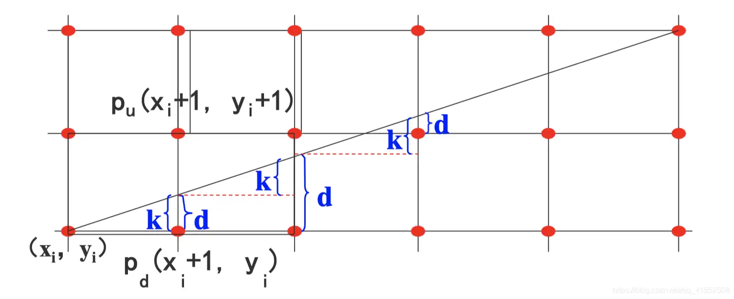 根据当前点,决定下一个(像素)点画在哪儿。要么在相邻点,要么在对角点。相邻点是指(x+1, y),或者(x+1, y+1)