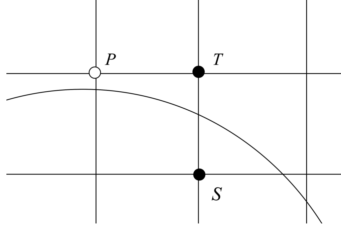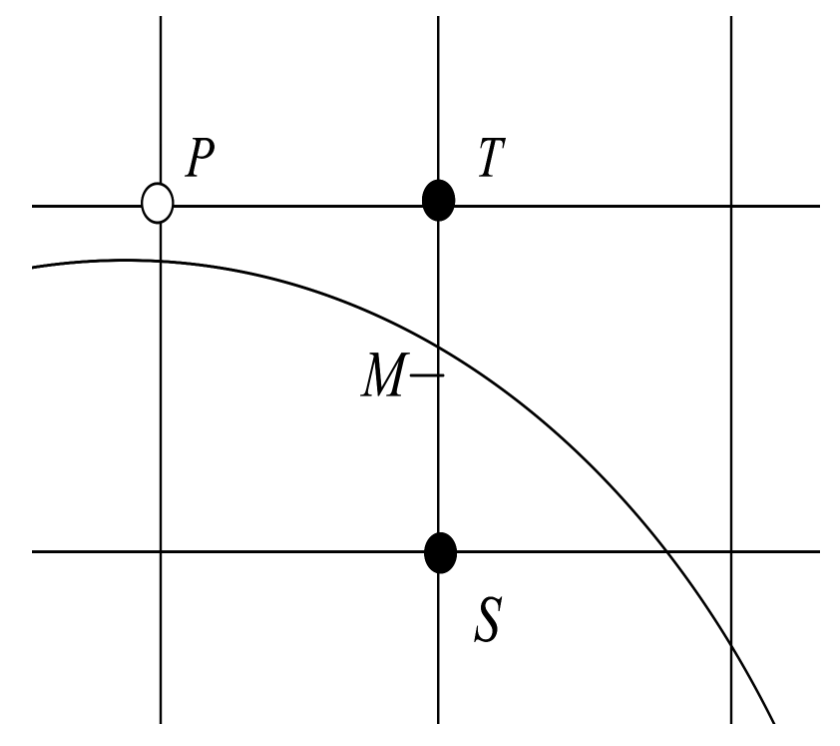 假设P为当前点亮象素,那么下一个点亮的象素可能是$T(x_p+1, y_p)$或$S(x_p+1, y_p - 1)$。 令M为T和S和中点,M的坐标为$(x_p + 1, y_p - 0.5)$。构造一个函数