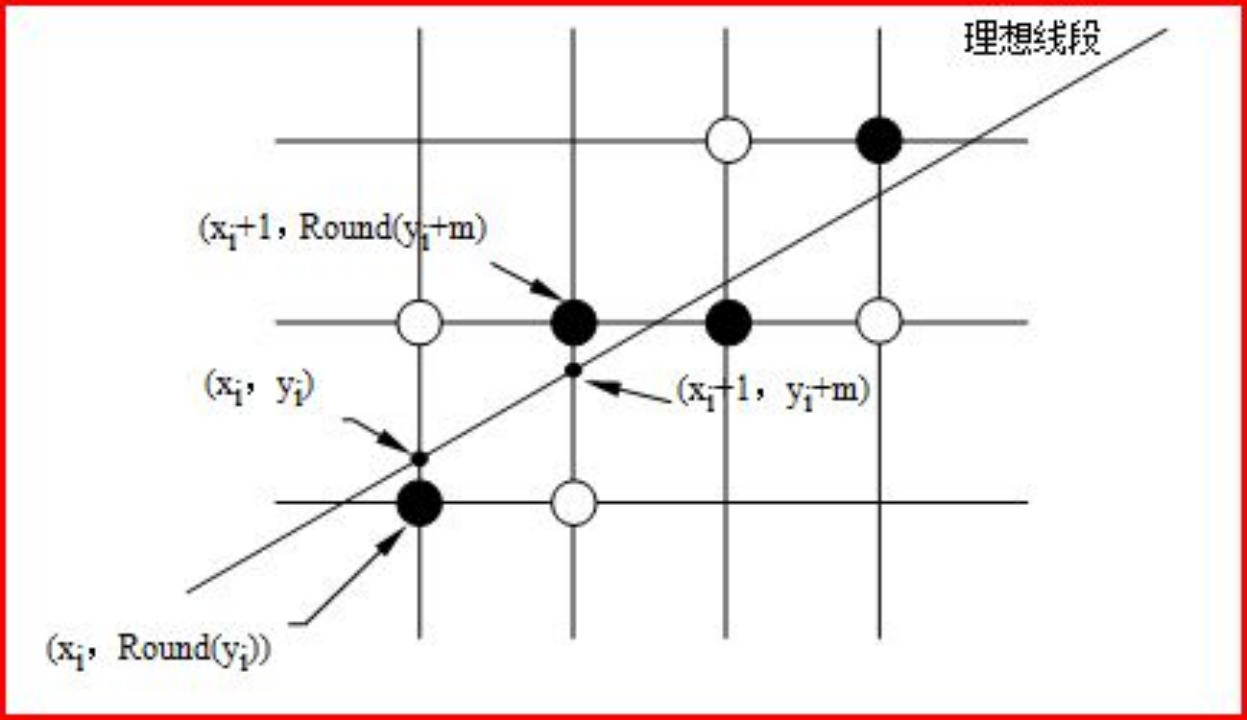算法思想是通过各行、各列像素中心构造一组虚拟网格线,按照直线起点到终点的顺序,计算直线与各垂直网格线的交点,然后根据误差项的符号确定该列像素中与此交点最近的像素。