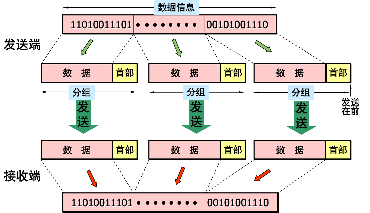 分组交换也采用存储转发技术, 但解决了报文交换中报文过长的问题. 源结点在发生之前, 先把较长的报文分成若干较小的登场数据段, 在每个数据段前面加上一些必要的控制信息(如源地址、目的地址和编号信息等)组成的首部, 构成分组(packet)