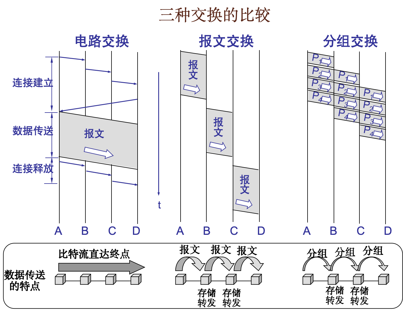 - 电路交换必为面向连接的, 面向连接却不一定是电路交换(分组交换也可以使用面向连接方式). 建立连接的时间太长了, 建立连接是传输数据的几千倍