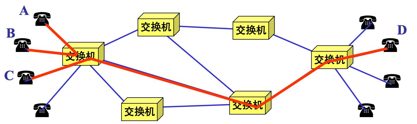 交换(Switching): 数据在网络节点之间转接的过程(A→B→C)
