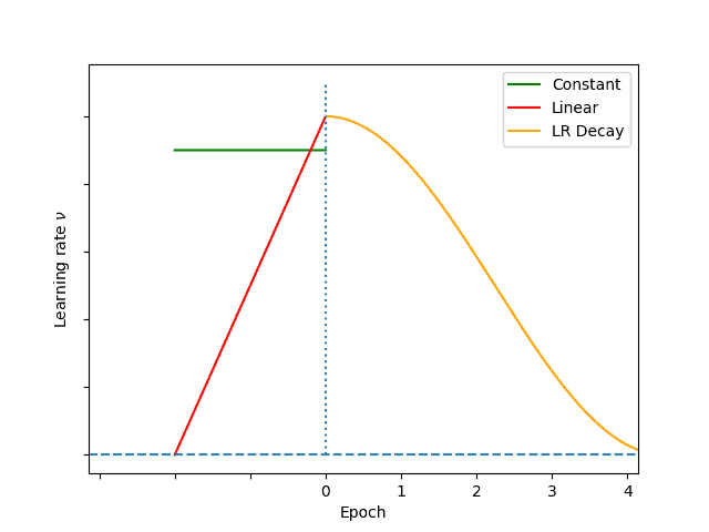 学习率从 0 线性增加到预设学习率,预热阶段结束后保持不变。该策略可以在训练初期逐步增加学习率,使模型在进入主训练阶段时平滑过渡。