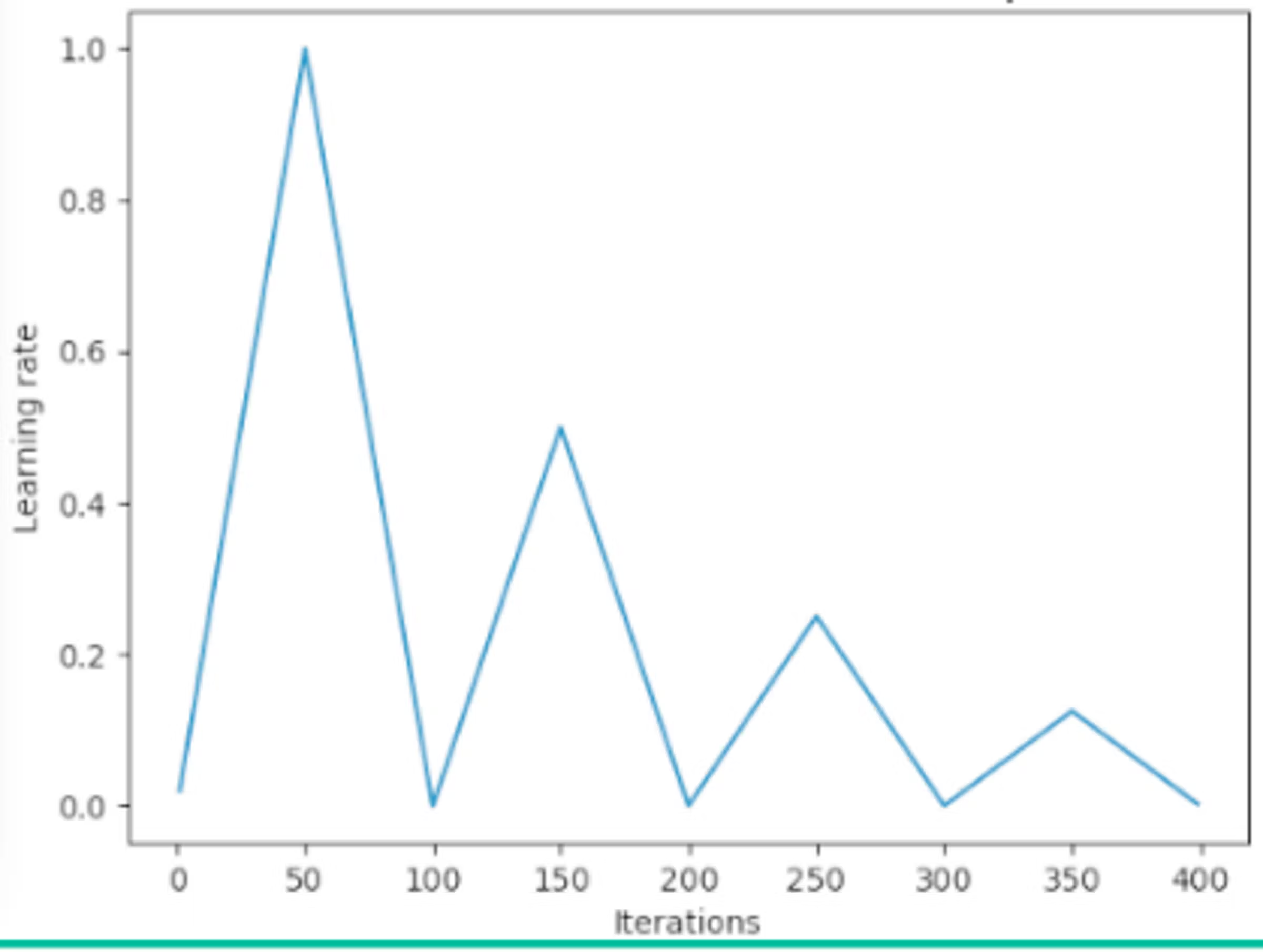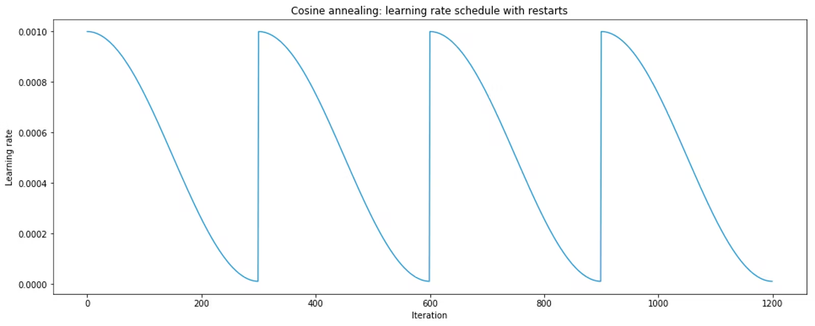 使用热重启和余弦退火的学习率调度程序具有以下形状: