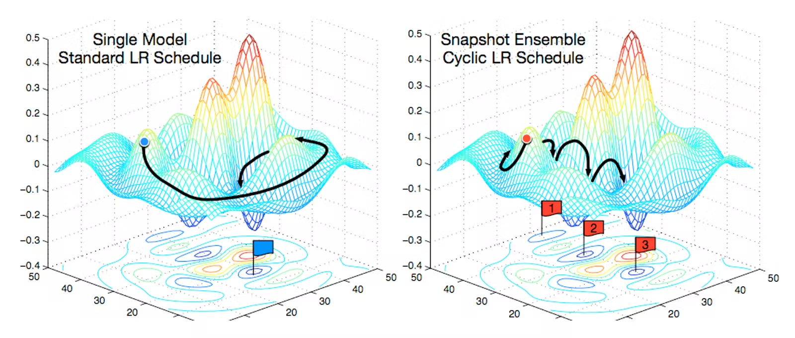 这两个学习器都收敛到相同的全局最小值。然而,在左侧,学习器沿着低梯度路径缓慢前进。在右侧,学习器陷入一系列局部最小值(谷底),然后使用热重启来越过它们(山丘)。在此过程中,它更快地找到相同的全局最小值,因为它所遵循的路径总体上具有更高的梯度。