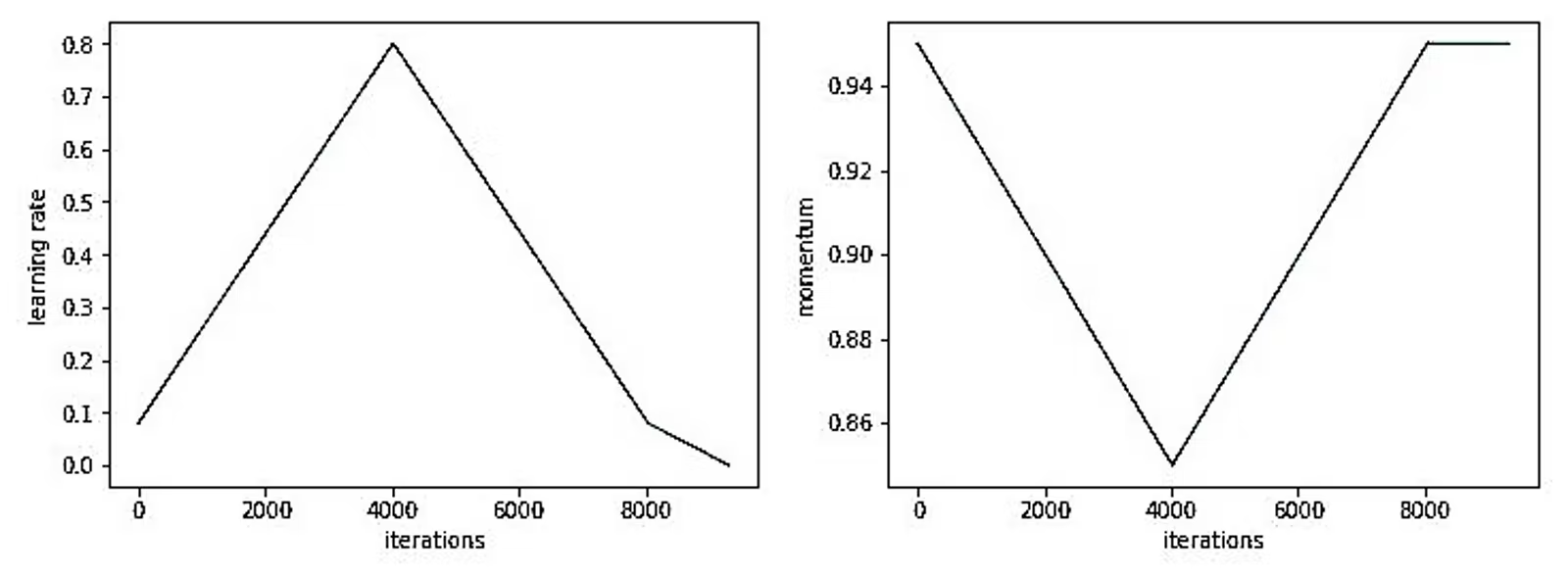 最佳情况下,学习率和动量应设置为刚好导致网络在峰值处开始发散的值。训练方案的其余部分包括热身、冷却和微调阶段。请注意,在微调期间,学习率会降至其初始值的 1/10。