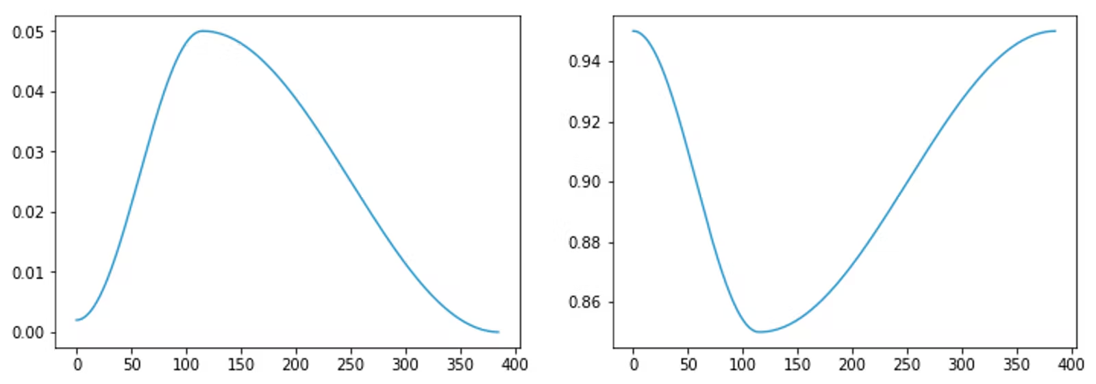 如下图所示,学习率呈现一个非对称的山峰形态,在峰值处达到模型性能的最大潜力,而动量的变化与学习率正好相反,确保训练在高速阶段依然稳定。