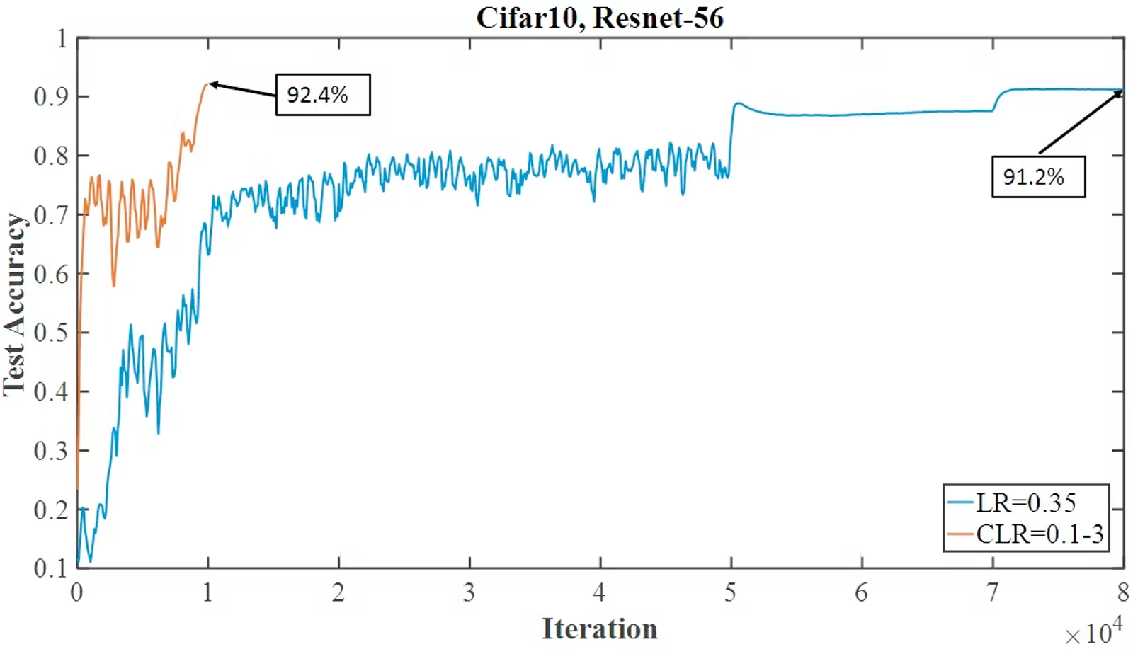 OneCycleLR 特别适合中、大规模模型的优化,它通过快速收敛机制在短时间内提升模型性能。例如,OneCycleLR 在 CIFAR-10 数据集上展示了超收敛现象——能够在短时间内接近甚至超越标准方法的性能。