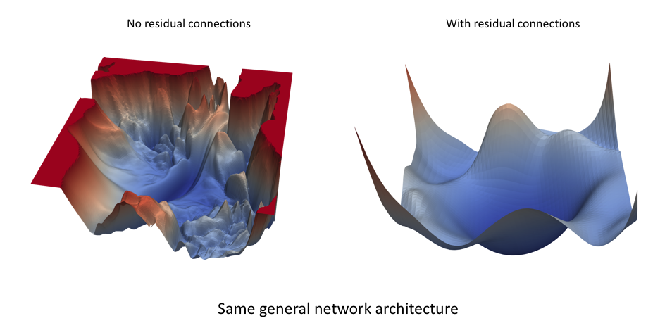 神经网络的损失景观(如下图所示)是网络参数值的函数,用于量化在对给定数据集执行推理(预测)时使用特定参数值配置所产生的“误差”。即使对于非常相似的网络架构,这种损失景观看起来也可能大不相同。下图来自一篇名为Visualizing the Loss Landscape of Neural Nets论文,该论文展示了网络中的残差连接如何产生更平滑的损失拓扑。