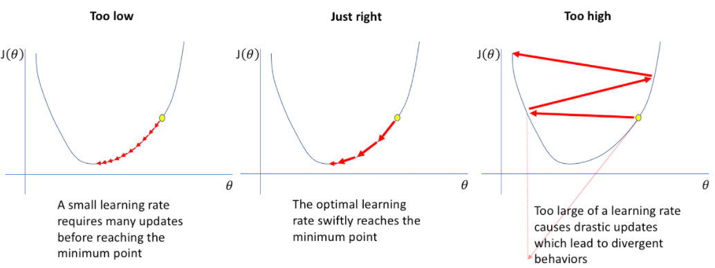 - 好的学习率是覆盖率和过冲(中间)之间的权衡。它不会太小,以便我们的算法可以快速收敛,也不会太大,以便我们的算法不会在没有达到最小值的情况下来回跳跃。